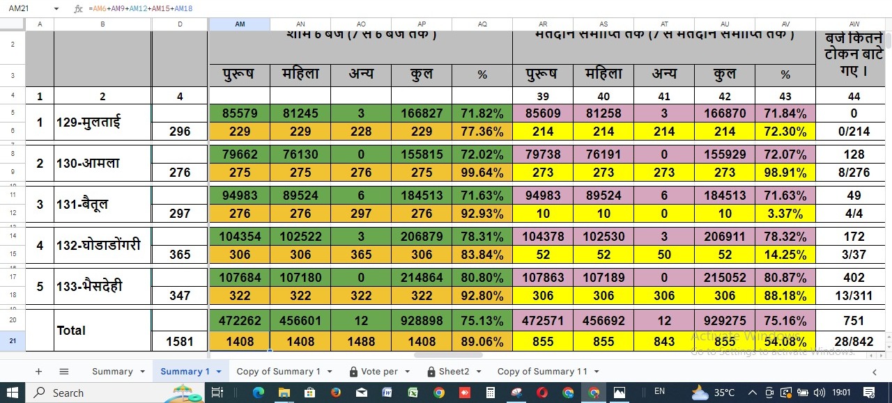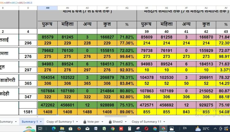 लोकसभा चुनाव में बैतूल जिले की 5 विधानसभा सीटों में कितना मतदान हुआ है इसके आंकड़े देखें तो जिले में सबसे अधिक मतदान भेसदेही में 80.87 %हुआ है। यहां 215052 मतदाताओं ने मतदान किया है वही दूसरे नंबर पर घोड़ा डोंगरी विधानसभा में मतदान के आंकड़े सामने आए हैं यहां पर 78.32 % मतदान हुआ। यहाँ 206911 मतदाता ने मतदान किया।
