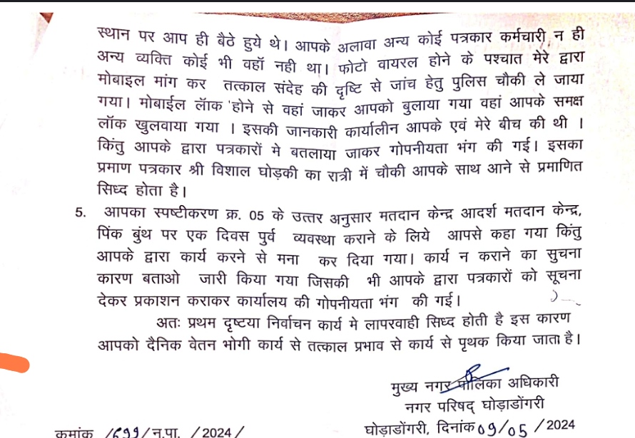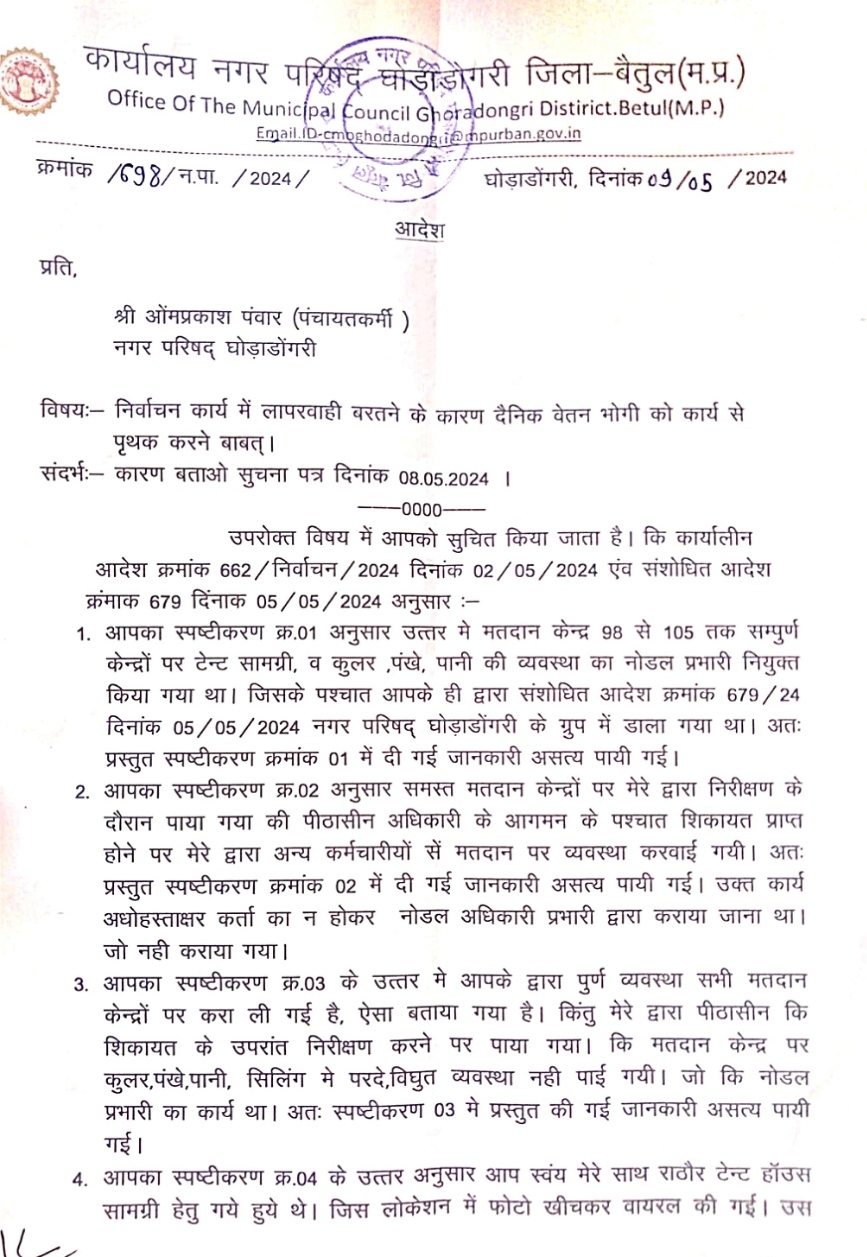 अतः प्रथम दृष्टया निर्वाचन कार्य मे लापरवाही सिध्द होती है इस कारण आपको दैनिक वेतन भोगी कार्य से तत्काल प्रभाव से कार्य से पृथक किया जाता है।