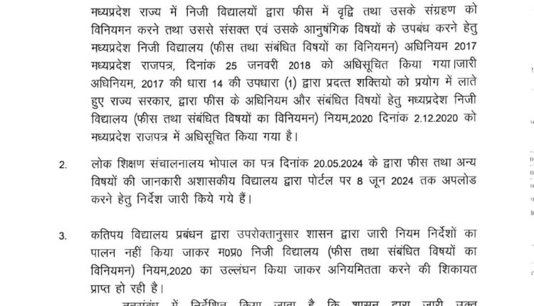 मध्यप्रदेश निजी विद्यालय (फीस तथा संबंधित विषयों का विनियमन) अधिनियम 2018 एवं नियम 2020 के प्रावधानों तहत कार्यवाही किये जाने विषयक ।