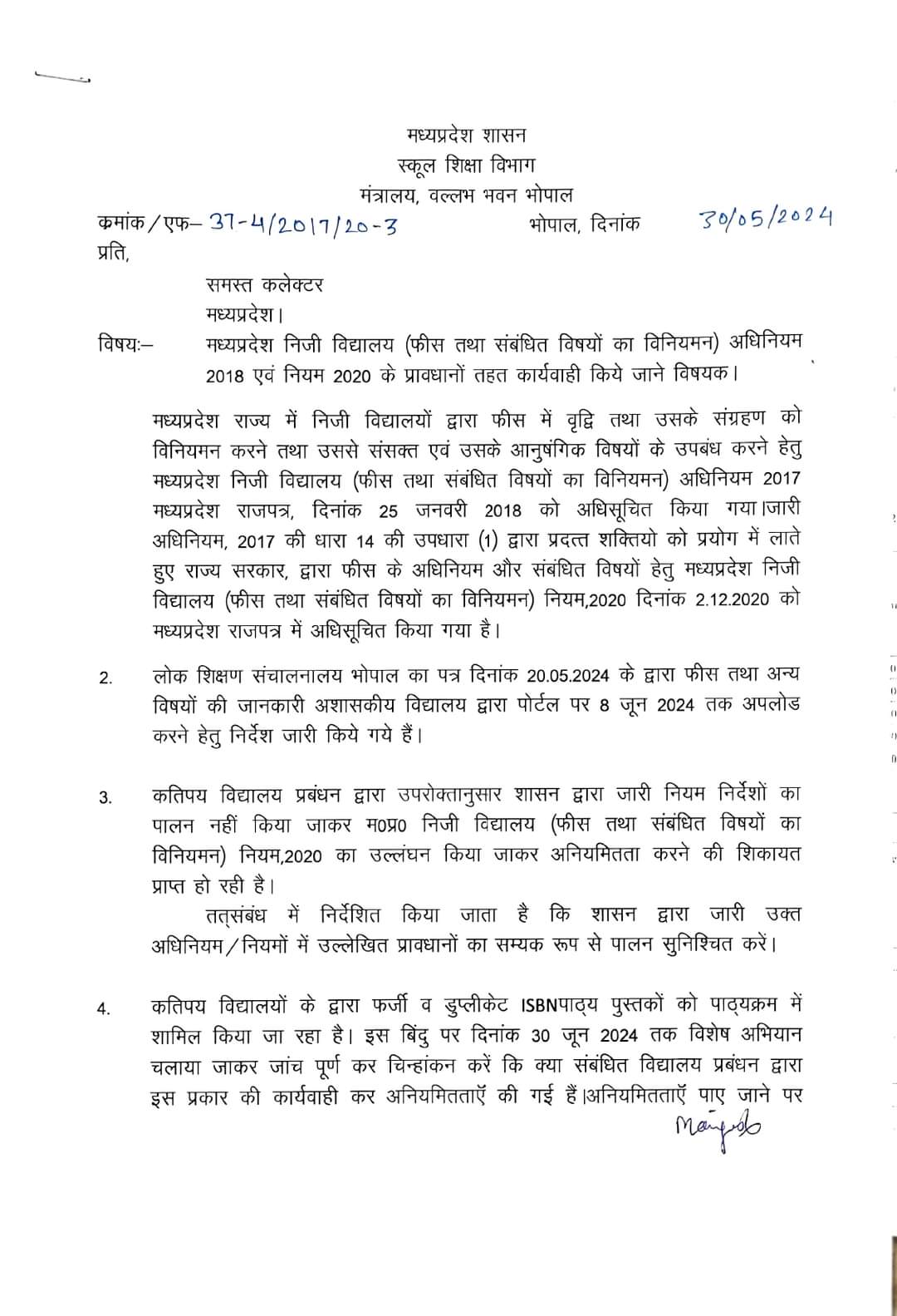 राज्य शासन ने सभी कलेक्टर को दिए निर्देश : कतिपय निजी विद्यालयों द्वारा फीस ओर फर्जी व डुप्लीकेट isbn पुस्तकों को पाठ्यक्रम में शामिल करने की विशेष अभियान चलाकर करे जांच
