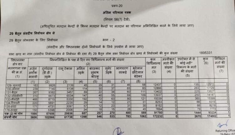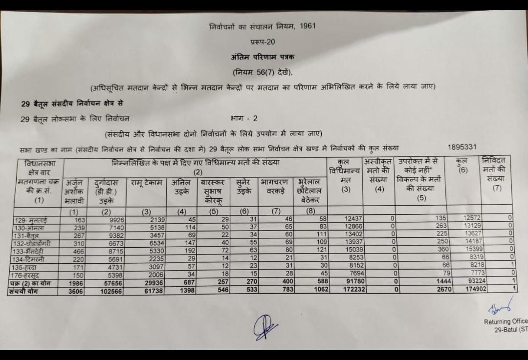 बैतूल हरदा लोकसभा सीट पर दो राउंड के रिजल्ट सामने आ चुके हैं। जिसमें कुल 174902 में से भाजपा प्रत्याशी डी डी उइके को 1 लाख 2566 वोट मिले हैं वहीं कांग्रेस प्रत्याशी रामू टेकाम को 61738 वोट प्राप्त हुए हैं नोटा को 2670 वोट मिले हैं दो राउंड के बाद भाजपा प्रत्याशी 40000 से अधिक मतों से आगे चल रहे हैं