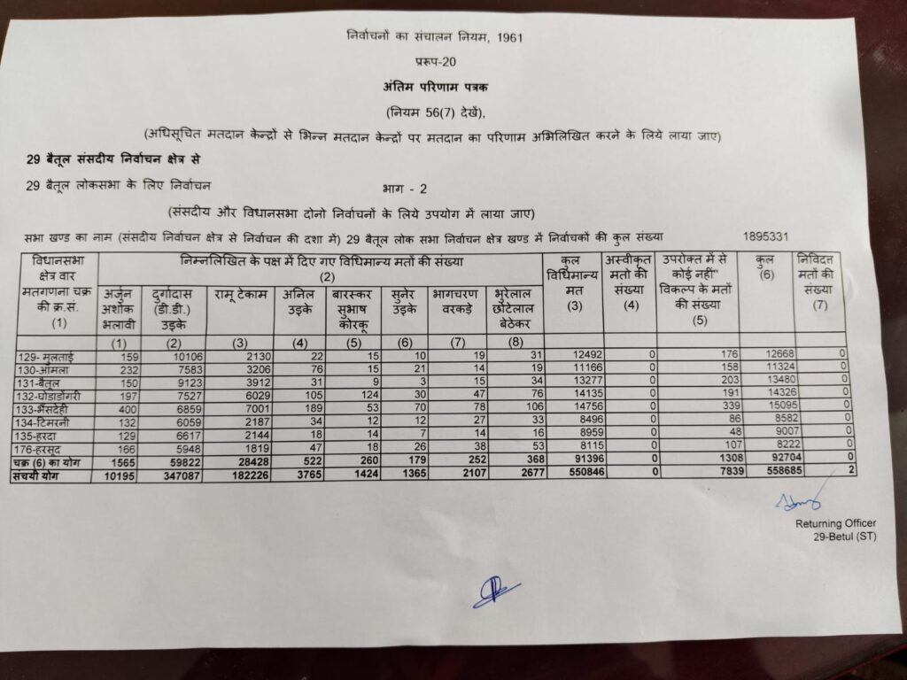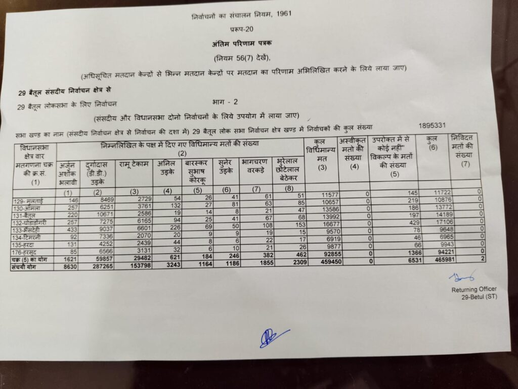 छटवे राउंड तक डीडी उईके को 3 लाख 47 हजार 87 वोट मिले जबकि रामू टेकाम 1 लाख 82 हजार226 मत ही ले सके है। तीसरे नंबर पर बीएसपी के अर्जुन भलावी 10195 मत प्राप्त कर सके है। जबकि इसके बाद सबसे ज्यादा नोटा को 7839 वोट मिले है। यहां अन्य उम्मीदवारों में अनिल उईके को 3765