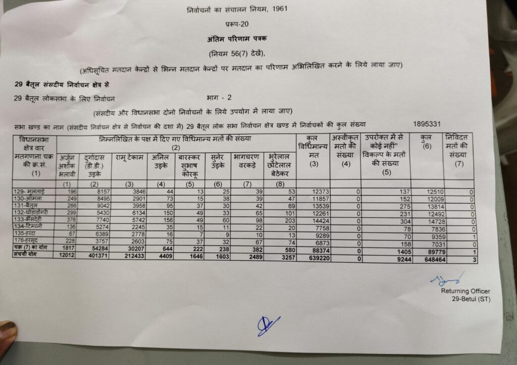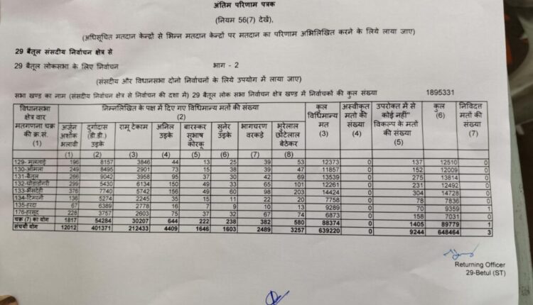 सातवें राउंड में बैतूल लोकसभा क्षेत्र की स्थिति By Aajkakhulasha On Jun 4, 2024 🔊 Listen This News अब तक 18 लाख 95 हजार 331 में से 6 लाख 39 हजार 220 मतों की सात राउंड में हो चुकी गणना।भाजपा के डीडी उइके को 7वे राउंड 4 लाख 1 हजार 371 वोट रामू टेकाम को 2 लाख 12 हजार 433 वोट मिले।अब तक 1 लाख 88 हजार 938 मतों की बढ़त।