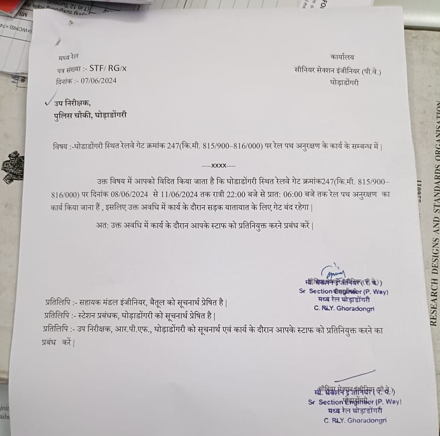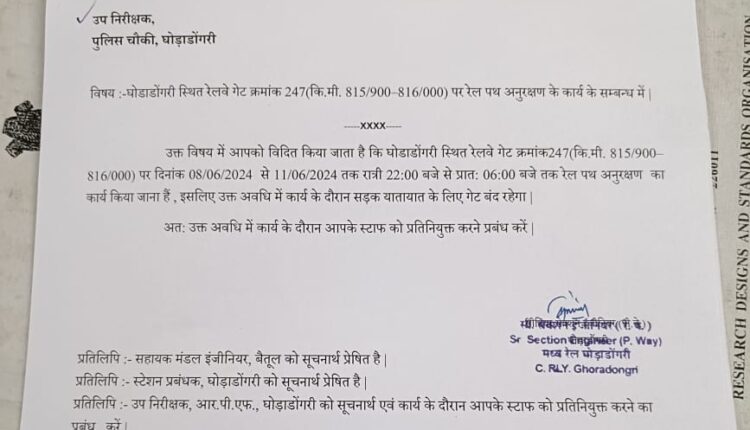 मध्य रेलवे के सीनियर सेक्शन इंजीनियर घोड़ाडोंगरी ने जानकारी दी है कि घोड़ाडोंगरी रेलवे गेट क्रमांक 247 पर दिनांक 8 जून से 11 जून तक रेल पथ अनुरक्षण का कार्य किया जाना है जिसके कारण इन चार दिनों में रात 10:00 से सुबह 6:00 तक रेलवे गेट बंद रहेगा