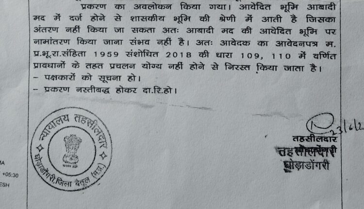 तहसीलदार ने दिया आदेश आबादी भूमि शासकीय भूमि की श्रेणी में आती है जिसका अंतरण नहीं किया जा सकता : फिर भी घोड़ाडोंगरी में धड़ल्ले से बिक रही आबादी भूमि