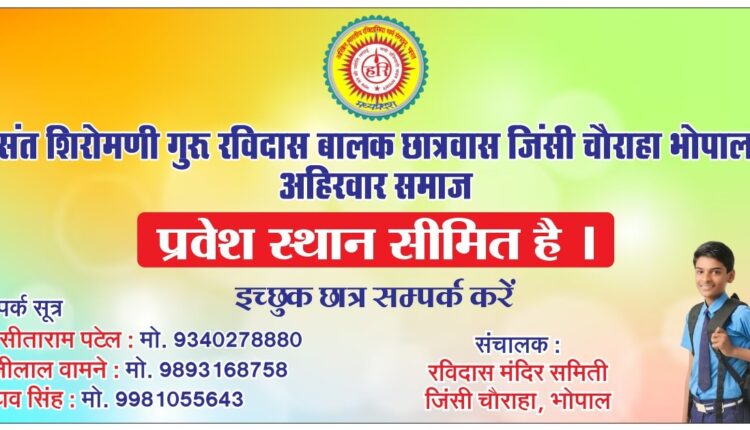 मध्य प्रदेश की राजधानी भोपाल में जिंसी चौराहा संत रविदास मंदिर अहिरवार समाज का ऐतिहासिक स्थल है। जहां पर मध्यप्रदेश के विभिन्न जिलों के बालक भोपाल में पढ़ने आते है, जो कि महंगे कमरों में रहने के लिए मजबूर थे।तथा बडे़ बडे़ छात्रावास में भी रहना होता है, जिनकी भी शुल्क बहुत अधिक रहती है।इस कारण गरीब लड़के अपनी पढा़ई नहीं कर पाते नतीजा रह रहता है कि फीस न देने के कारण बीच में ही पढा़ई छोड़ कर जाना पड़ता है।