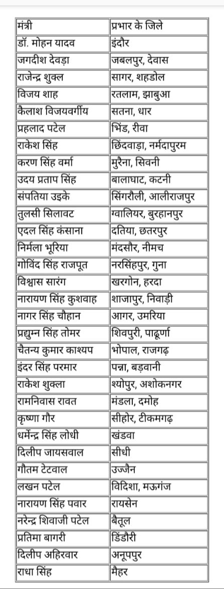 *बड़ी खबर भोपाल* *मध्यप्रदेश के प्रभारी मंत्रियों के ज़िले हुए घोषित*