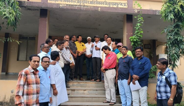 बुरहानपुर- मध्य प्रदेश राज्य कर्मचारी संघ जिला शाखा बुरहानपुर की ओर से को सहायक आयुक्त जनजातीय विभाग के सामने क्रमोन्नत एवं समयमान वेतनमान एरियर सहित 10 सूत्रीय मांगों को लेकर रैली के रूप में सहायक आयुक्त जनजातीय विभाग पहुंच कर सहायक आयुक्त नाम ज्ञापन सौंपा। मध्य प्रदेश राज्य कर्मचारी संघ के जिला अध्यक्ष सुरेश पवार एवं ब्लॉक अध्यक्ष सुनील कोटवे ने बताया कि कर्मचारियों की क्रमोन्नत वेतन एरियर सहित 10 मांगों के निराकरण के लिए सहायक आयुक्त को ज्ञापन सौंपा|दिलीप इंगले एवं संजय चौधरी ने कहां की लेटलतीफी होने पर चरणबद्ध आंदोलन किया जायेगा।