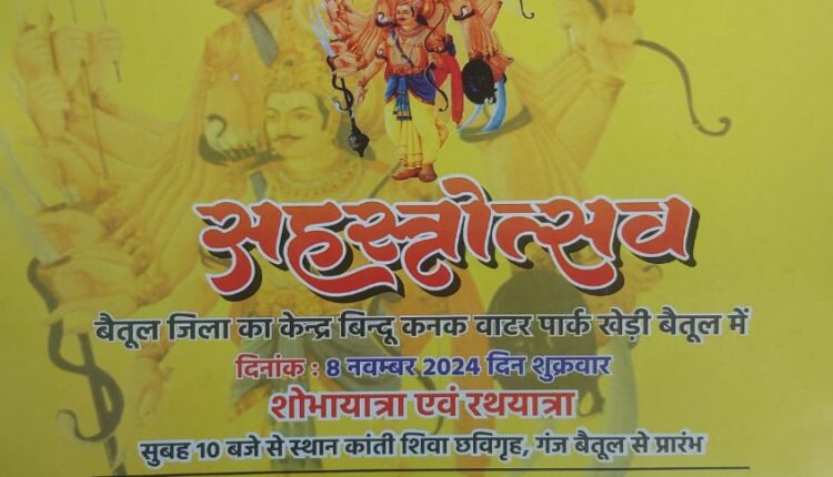 भगवान सहस्त्रबाहु जयंती के अवसर पर बैतूल जिला कलचुरी कलार समाज संगठन बैतूल के तत्वाधान में 8 नवंबर दिन शुक्रवार को हैहय कलचुरी कलार समाज के आराध्य राजराजेश्वर भगवान सहस्त्रबाहु जयंती कार्यक्रम मनाया जाएगा बैतूल जिला कलार समाज संगठन जयंती की धूमधाम से तैयारी कर रहा है कलचुरी कलार समाज सहस्त्रबाहु जयंती उत्सव पर विभिन्न कार्यक्रम भी आयोजित कर रहा है जयंती का शुभारंभ बैतूल जिला के कांति शिवा टॉकीज चौक से वाहन रैली के रूप में प्रारंभ होगा जिसमें भगवान सहस्त्रबाहु की रमणीय आकृति और रथ पर भगवान सहस्त्रबाहु के प्रतिबिंब की झांकी भी देखने को मिलेगी यह वाहन रैली शोभायात्रा बैतूल से प्रारंभ होकर सभी प्रमुख मार्गो से होती हुई सांवलीगढ़ कनक फन सिटी वाटर पार्क में पहुंचेगी जहां पर भगवान सहस्त्रबाहु का पूजन अभिषेक कार्यक्रम किया जाएगा कार्यक्रम में सामाजिक अति वरिष्ठ बंधु सम्माननीय बुजुर्गों का सम्मान समाज के द्वारा किया जाएगा वहीं समाज के प्रतिभावान छात्र-छात्राओं को भी मंच से समाज के द्वारा ही सम्मानित कर उन्हें उपहार दिए जाएंगे ,