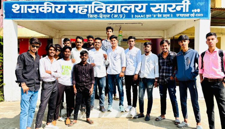 सारनी।शासकीय कॉलेज सारनी में कल एनएसयूआई द्वारा 6 सूत्रीय माँगों को लेकर एनएसयूआई के रोहन सिंह ठाकुर के नेतृत्व में ज्ञापन सौपा।जिसने मुख्य रूप से एनएसयूआई एवं छात्रों की माँग है की विधानसभा चुनाव के पूर्व में मध्य प्रदेश के पूर्व सीएम शिवराज सिंह चौहान एवं प्रदेश के
