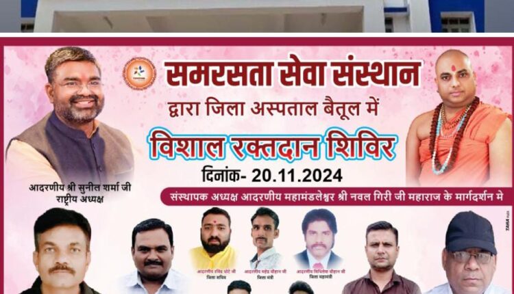 बैतूल। समरसता सेवा संस्थान द्वारा 20 नवंबर 2024 को जिला चिकित्सालय बैतूल में विशाल रक्तदान शिविर का आयोजन किया जा रहा है। यह शिविर संस्थान के संस्थापक अध्यक्ष महामंडलेश्वर नवल गिरी महाराज और राष्ट्रीय अध्यक्ष सुनील शर्मा के मार्गदर्शन और प्रदेश अध्यक्ष डॉ. किशोर धोटे के नेतृत्व में आयोजित किया जायेगा।
