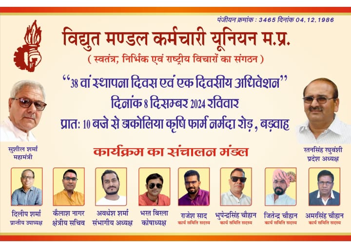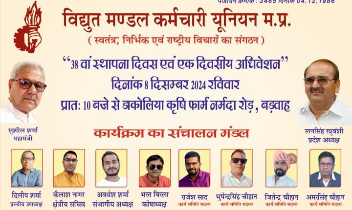विद्युत मंडल कर्मचारी यूनियन के स्थापना दिवस पर —- कार्मिको, आउटसोर्स, ठेका श्रमिकों की समस्याओ पर होगी चर्चा। क्षेत्रीय महामंत्री। सारनी — विद्युत मंडल कर्मचारी यूनियन मध्यप्रदेश का एक दिवसीय स्थापना दिवस 8 दिसम्बर रविवार को अधिवेशन बड़वाह जिला खरगोन में आयोजित किया गया है। यूनियन के क्षेत्रीय महामन्त्री अंबादास सूने ने जारी प्रेस विज्ञप्ति में बताया कि यूनियन के अधिवेशन में 17 सूत्रीय प्रस्ताव पर विस्तार से चर्चा की जावेगी। एक विद्युत वितरण कंपनी हो ,मुख्यालय भोपाल। औद्योगिक विवाद अधिनियम 1947 के अनुरूप श्रमिक संघो से गठित समिती पर चर्चा। विद्युत क्षेत्र में ठेकेदारी प्रथा निजीकरण का विरोध।