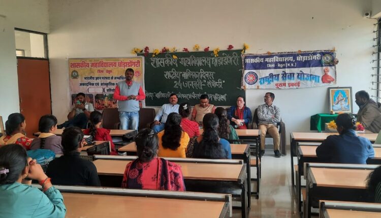 *बालिकाओं का सम्मान कर,की उनके उज्जवल भविष्य की कामना* शासकीय महाविद्यालय घोड़ाडोंगरी में आज दिनांक 24 जनवरी को उच्च शिक्षा विभाग एवं शासन द्वारा जारी त्रैमासिक कैलेंडर के परिपालन में राष्ट्रीय बालिका दिवस का आयोजन किया गया इस अवसर पर महाविद्यालय के प्राचार्य डॉ. देवीसिंह सिसोदिया सहित समूचे स्टाफ ने छात्राओं को पुष्प कुछ देकर उनका सम्मान किया और उनके अधिकार प्राचीन एवं वर्तमान परिदृश्य विषय पर अपने उद्बोधन में समाजशास्त्र के प्राध्यापक एवं मीडिया सेल प्रभारी प्रो. हेमंत कुमार निरापुरे ने कहा कि आज के वर्तमान परिवेश में लिंगानुपात में बढ़ोतरी यह साबित करता है कि समाज के हर क्षेत्र में महिला आगे बढ़ रही है, महिलाओं के प्रति आए