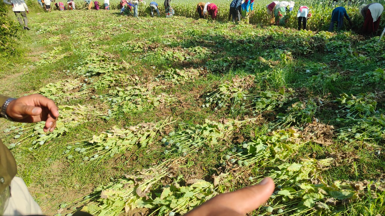 जिसकी जानकारी मिलने पर पुलिस ने कार्रवाई करते हुए लगभग आधा एकड़ से अधिक 55 डेसिमल क्षेत्र में अफीम के पौधे उखाड़वाय और देर रात तक कार्रवाई की ।