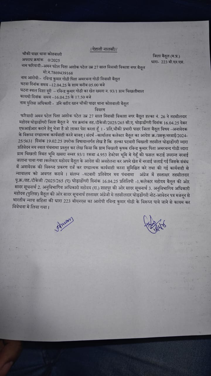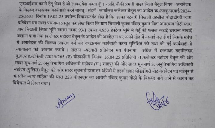 घोड़ाडोंगरी तहसीलदार ने नरवाई जलाने पर एक किसान के खिलाफ एफ आई आर दर्ज कराई है ग्राम चिखली कृषक रविन्द्र कुमार पिता अमरचन्द गोठी व्दारा ग्राम चिखली स्थित भूमि खसरा नम्बर 93/1 रकबा 4.953 हेक्टेयर भूमि मे गेहूं की फसल कटाई उपरान्त नरवाई जलाना पाया गया। कलेक्टर महोदय बैतूल के आदेश की अवहेलना कर अपने खेत में नरवाई जलाई गई । जिसके संबंध में अनावेदक की विरूध्द प्रकरण दर्ज कर दण्डात्मक कार्यवाही करना सुनिश्चित करे ।