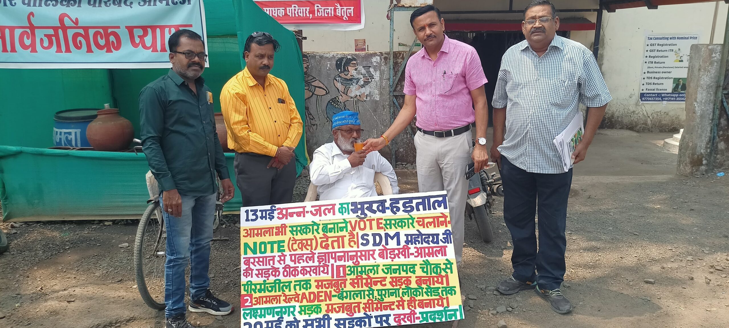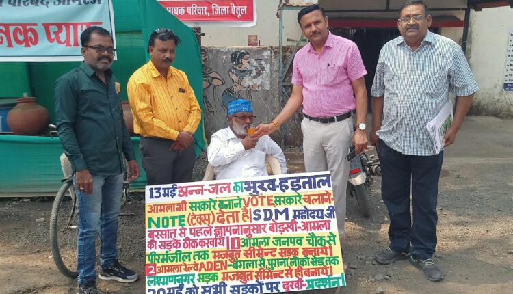 आमला समाज सेवक चंद्रशेखर पंडोले ने शहर की सड़कों के जानलेवा गड्डों को भरने के लिए जनपद चौक पर मंगलवार से भूख हड़ताल शुरू की थी। एसडीएम शैलेंद्र बड़ोनिया ने जूस पिलाकर भूखहड़ताल खत्म करवाई।