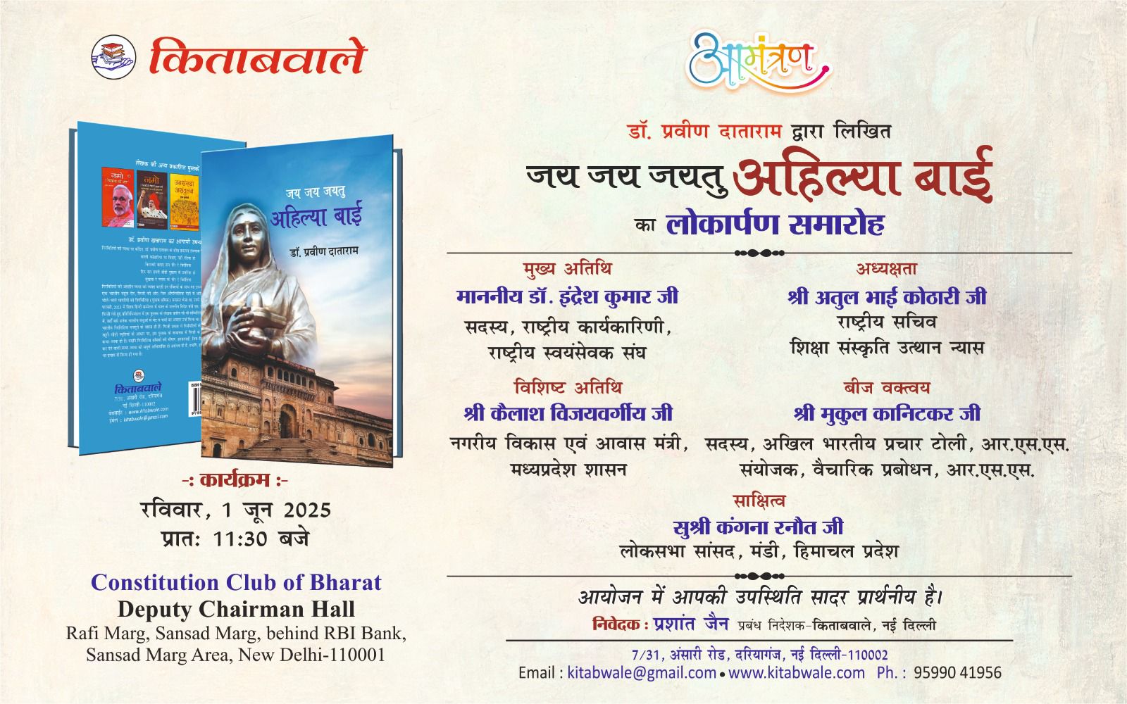 मित्रों, आदरपूर्वक सूचना है कि मेरी नवप्रकाशित पुस्तक “जय-जय जयतु अहिल्या बाई” का लोकार्पण दिल्ली के कांस्टीट्यूशनल क्लब में कल रविवार, एक जून को आयोजित है।