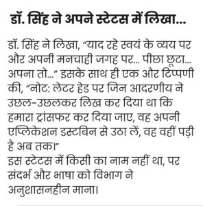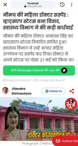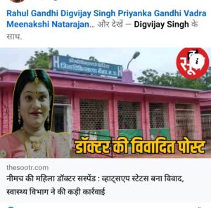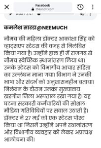 एक स्टेटस लगाने पर महिला चिकित्सक को सस्पेंड करने का मामला इन दिनों सोशल मीडिया पर छाया हुआ है । मध्य प्रदेश के नीमच जिले की महिला चिकित्सक ने स्टेटस लगाया और इसे आपत्तिजनक मानते हुए महिला चिकित्सक को आचार संहिता उल्लंघन पर सस्पेंड कर दिया गया ।