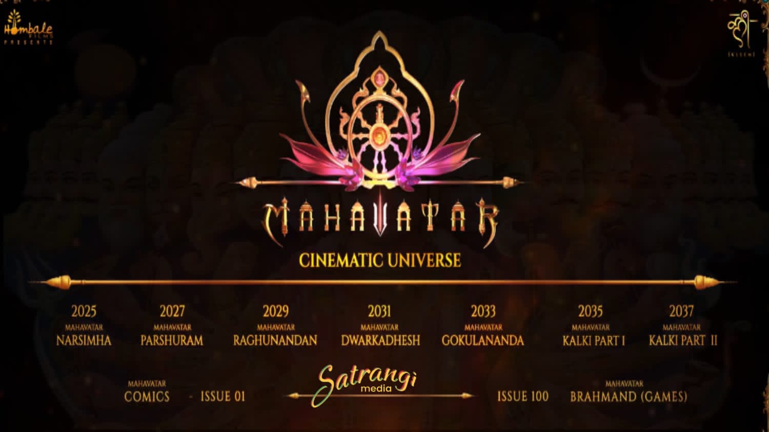 मुंबई:- होम्बले फिल्म्स और क्लीम प्रोडक्शंस ने अपनी एनिमेटेड फ्रेंचाइज़ महावतार सिनेमैटिक यूनिवर्स की बड़ी घोषणा कर दी है। इस सीरीज में भगवान विष्णु के दस अवतारों की कहानियां दिखाई जाएंगी, जो अगले एक दशक तक चलेंगी। इसकी शुरुआत महावतार नरसिम्हा से 2025 में होगी और अंत महावतार कल्कि पार्ट 2 के साथ 2037 में होगा।