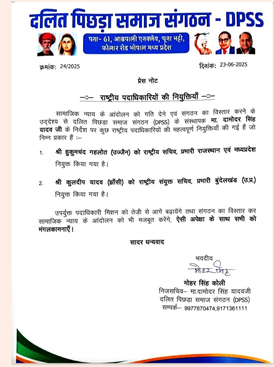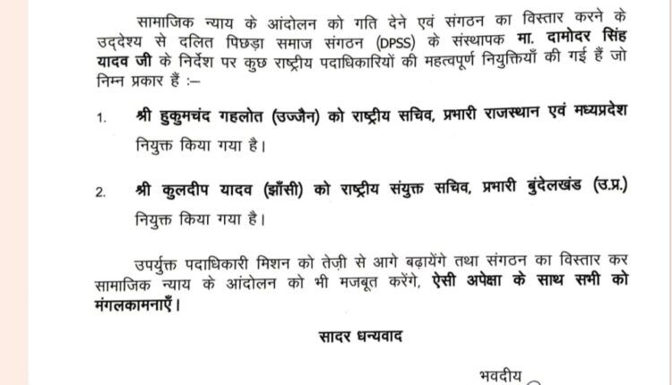 भोपाल। सामाजिक न्याय के आंदोलन को गति देने, वंचितों के न्याय की लड़ाई को समर्पित दलित पिछड़ा समाज संगठन के विस्तार करने के उद्देश्य से संगठन के संस्थापक दमोदर सिंह यादव की सहमति से संगठन के राष्ट्रीय पदाधिकारियों की नियुक्तयां की गई है।