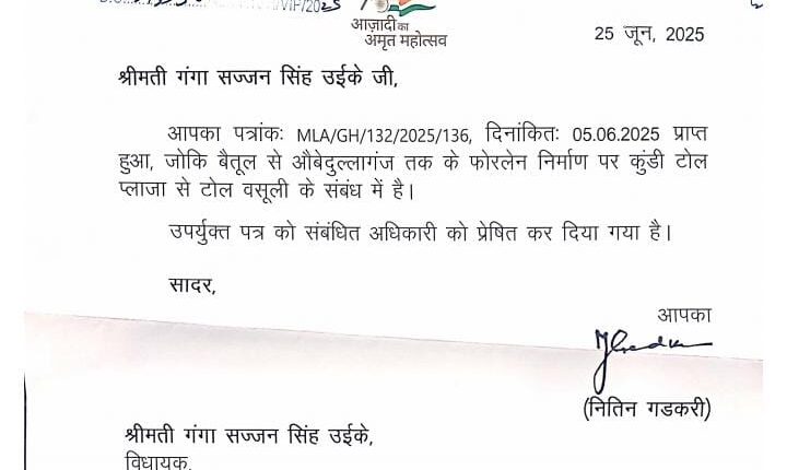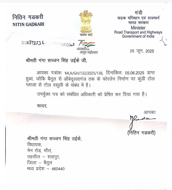 शाहपुर।घोड़ाडोंगरी विधायक गंगा सज्जन सिंह उईके के पत्र पर केंद्रीय सड़क परिवहन एवं राजमार्ग मंत्री नितिन गडकरी ने कार्रवाई की है। श्रीमती उईके ने बैतूल से औबेदुल्लागंज तक फोरलेन निर्माण पर कुंडी टोल प्लाजा से टोल वसूली के संबंध में पत्र लिखा था।