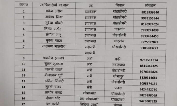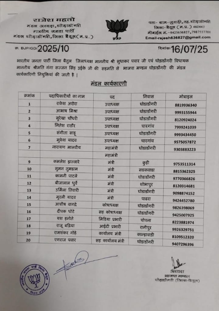 मंडल समिति में छह उपाध्यक्ष, एक महामंत्री, छह मंत्री एवं एक कोषाध्यक्ष की घोषणा की गई है। घोेडाडोगरी मंडल की घोषित मंडल समिति में उपाध्यक्ष राकेश अरोरा (घोडाडोगरी), आभाष मिश्रा (घोडाडोगरी), सुरेखा चौधरी (घोडाडोगरी), नितेश राठौर (चारगांव), संगीता साहू (घोडाडोगरी), मूकेश यादव (चारगांव), महामंत्री नारायण मालवीय (घोडाडोगरी), मंत्री कमलेश झल्लारे (कुही), सुमन तूमडाम (सडकवाडा), कामनी पाटले (घोडाडोगरी), बीजालाल धुर्वे (शोभापुर), उर्मिला तिवारी (घोडाडोगरी), मूरली यादव (पाढरा) एवं कोषाध्यक्ष आशीष वागद्रे (घोडाडोगरी), सह कोषाध्यक्ष दीपक घोटे (घोडाडोगरी), मीडिया प्रभारी यश हनोते (चोपना), आईटी प्रभारी राजू बढ़िया (रानीपुर), कार्यालय मंत्री रामशंकर गोहे (कान्हावाडी ) और सह कार्यालय मंत्री एगराज पंवार (घोडाडोगरी) को बनाया गया है। इसी प्रकार फूलवंती धुर्वे, सुशीला धुर्वे, शारदा धुर्वे, मोनिका सिनोटिया, निशा धुर्वे, सरिता उइके, नेहा उइके, ललिता मालवी, सविता पठारिया, अंजू मालवीय, शोभा अग्रवाल, ममता अशवारे,प्रतिभा मालवीय, कस्तूरी उइके, पिंकी सेन, प्रशांत गावंडे, महेश अग्रवाल, विकास अग्रवाल, डॉ.दीपक मालवीय, राकेश अग्रवाल, राजेश साहू, जगन्नाथ यादव,