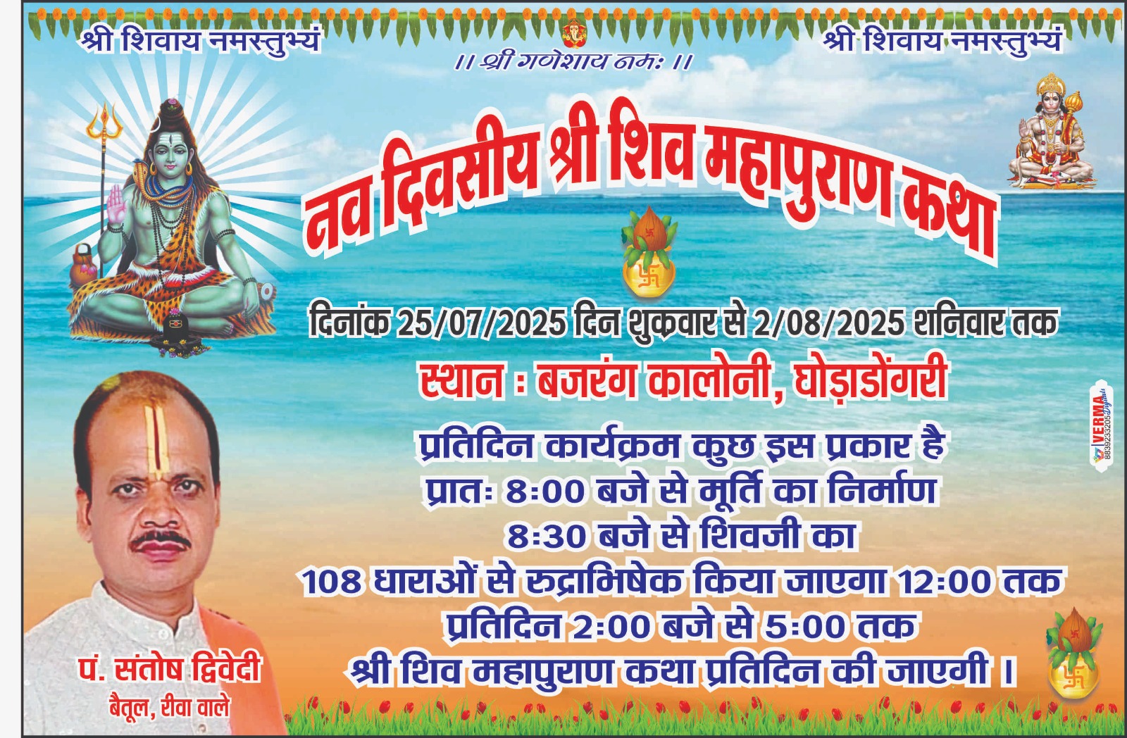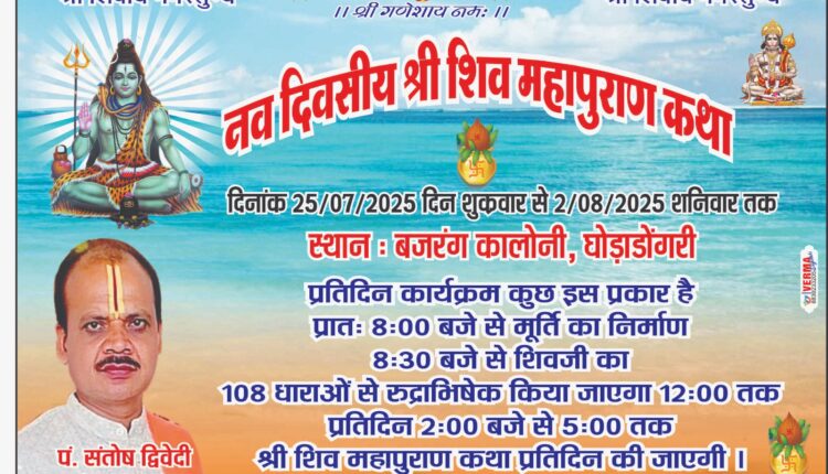 घोड़ाडोंगरी सावन माह के पावन अवसर पर नगर के बजरंग कॉलोनी में 25 जुलाई से 2 अगस्त तक श्री शिव महापुराण कथा का आयोजन किया जा रहा है प्रतिदिन सुबह 8:00 बजे से मूर्ति का निर्माण किया जाएगा ।
