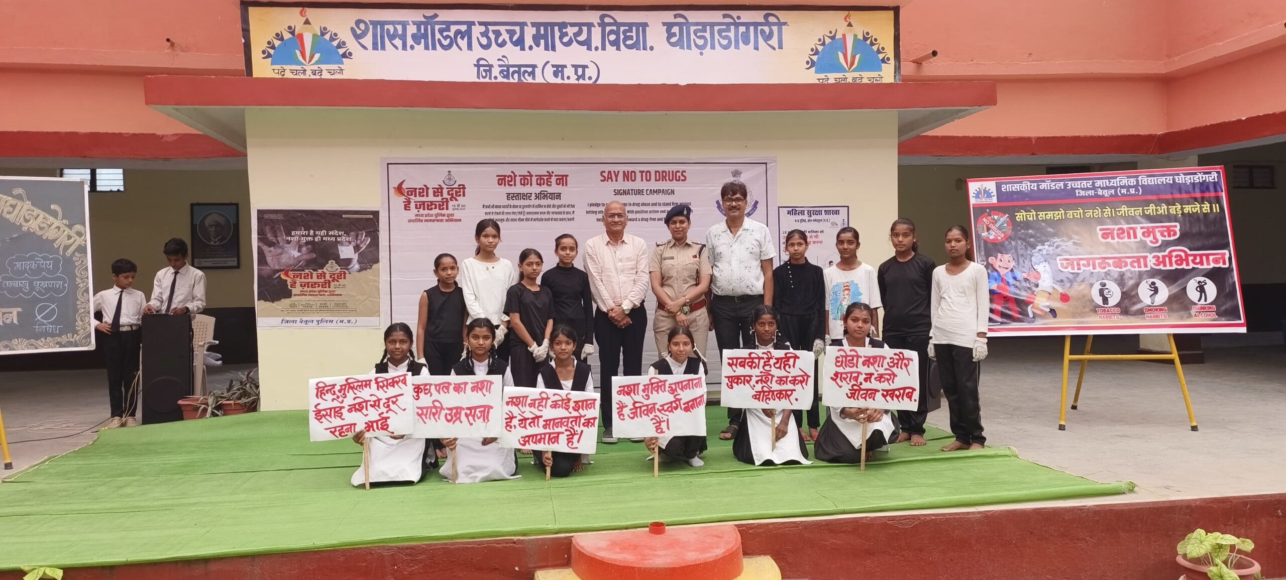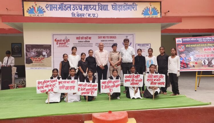 घोड़ाडोंगरी । मॉडल स्कूल घोड़ाडोंगरी में गुरुवार छात्रों को दोपहर पश्चात नशामुक्ति अभियान ,नशे के दुष्प्रभाव के अंतर्गत छात्र/छात्राओं ने गीत,भाषण,नाटक के माध्यम से एक से बढ़कर एक शानदार प्रस्तुति दी । कार्यक्रम के मुख्य अतिथि संकुल प्राचार्य एवं सांदीपनि विद्यालय के प्राचार्य श्री विवेक तिवारी घोड़ाडोंगरी चौकी प्रभारी आम्रपाली दहात,हेड कांस्टेबल रमेश टेकाम द्वारा 390 छात्र/छात्राओं को नशामुक्ति पर समझाइश ,जन जागरुकता संदेश दिया वही छात्रों को घर घर जाकर नशामुक्ति अभियान चलने को कहा । चौकी प्रभारी आम्रपाली दहात ने छात्रों को नशे से होने वाले दुष्परिणामों से अवगत कराया वहीं नशीले पदार्थों का सेवन एक गंभीर सामाजिक समस्या है जो व्यक्ति, परिवार और समाज को गहरे स्तर पर प्रभावित करता है । उन्होंने नारे के माध्यम से कहा” हमारा है यही संदेश नशा मुक्त हो मध्यप्रदेश” किसी भी चीज का नशा व्यक्तियों के स्वास्थ्य को खतरे में डालती है बल्कि अपराधों में वृद्धि का भी एक प्रमुख कारण है इस गंभीर समस्या से समाधान और एक स्वस्थ एवं नशा मुक्त समाज के निर्माण हेतु ,”नशे से दूरी है जरूरी” एक व्यापक नशा मुक्ति जन जागृति अभियान पूरे मध्यप्रदेश में चलाया जा रहा है