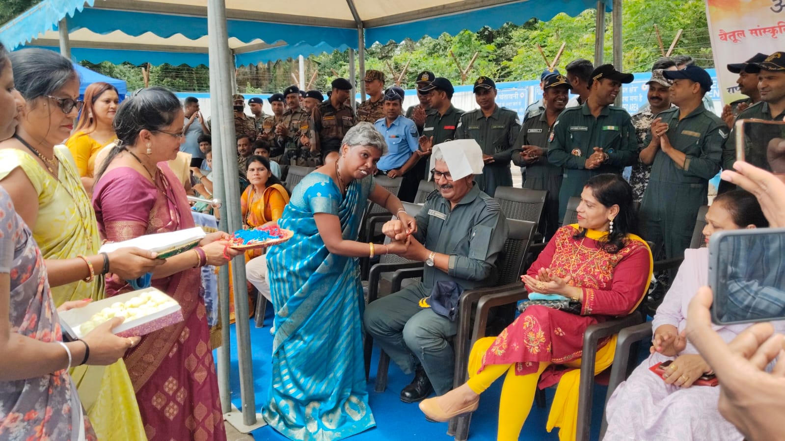 उन्होंने कहा कि कोविड 19 के बाद से राष्ट्र रक्षा मिशन ने एक नई शुरुआत करते हुए पहले घर में और फिर सरहद पर रक्षा बंधन मनान शुरु किया है। बीते चार वर्षों से यह दल पहले आमला पहुंचकर एयर फोर्स और रक्षा बंधन के दिन सरहद पर पहुंचकर फ्रंट लाईन पर तैनात जवानों के साथ राखी का पर्व मना रहे है। उन्होंने यह अपेक्षा भी की नेह के धागों का यह बंधन और परम्परा आगे भी इसी तरह चलती रहे। रक्षा बंधन के पूर्व जब एक साथ इतनी बहनों को जवानों ने देखा तो सभी खुश हो गए। सभी ने राखी बंधवाते हुए कहा भी कि आज परिवार की कमी को आप सभी बहनों ने दूर कर दिया। सेना के जवान त्यौहार के दौरान बहुत कम ही अपने घर जा जाते है ऐसे में राष्ट्र रक्षा मिशन जब आमला पहुंचा तो सभी जवानों को घर के जैसे माहौल देने का प्रयास किया गया। हंसी-ठिठोली और गीतों के बीच रक्षाबंधन का पर्व मनाया गया। संस्था की नन्ही सदस्य एवं श्री श्री ज्ञान मंदिर स्कूल की छात्रा गरिमा वागद्रे ने मां से है माटी गीत पर भावपूर्ण प्रस्तुति दी तो प्रिया सुनारिया के गीतों ने समां बांध दिया।