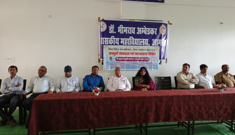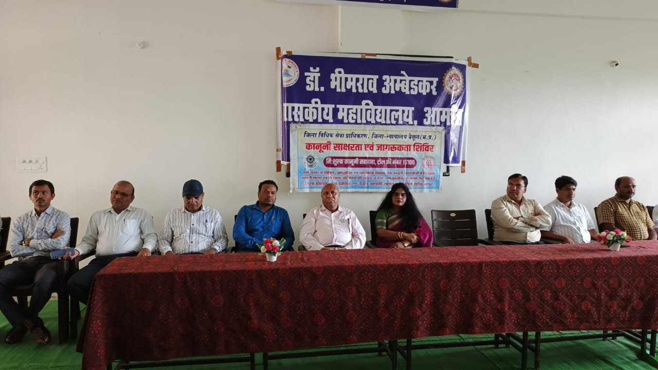 तहसील विधिक सेवा समिति आमला द्वारा आयोजित व जिला विधिक सेवा प्राधिकरण जिला न्यायालय बैतूल के मार्गदर्शन में डॉ भीमराव अम्बेडकर शासकीय महाविद्यालय आमला में निःशुल्क कानूनी साक्षरता एवं जागरूकता शिविर का आयोजन किया गया । शिविर में विदुषी न्यायधीश एवं जिला विधिक सेवा प्राधिकरण बैतूल माननीया श्रीमति शर्मिला बिलवार जी के द्वारा महाविद्यालयीन छात्रों को घरेलू हिंसा , शारीरिक प्रताड़ना , बाल अपराध से संबंधित अन्य विषयों पर जानकारी दी गई । उन्होंने बालश्रम , बालविवाह व सुलभ न्याय आमजन को कैसे प्राप्त हो इस विषय पर विस्तार पूर्वक जानकारी प्रदान की ।