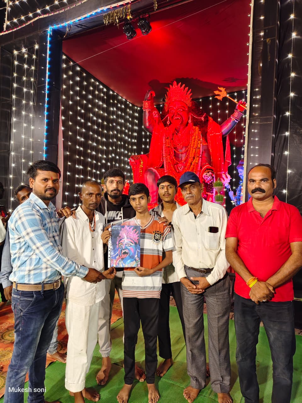 अपने नन्हें हाथों से चित्रकला का प्रदर्शन करते हुवे हूबहू माता रानी की पेंटिंग बनाईतथा मां काली समिती बस स्टैंड के सदस्यों को भेंट की,शौर्य नागले ने बताया कि पिछले दो वर्षों से उन्होंने पेंटिंग बनाना शुरू किया है इससे पूर्व भी उन्होंने गणेश भगवान का हूबहू चित्र बनाया था उन्होंने बताया कि चित्रकला वो अपने शौक के लिए करते हैं, वही मां काली समिती बस स्टैंड सारनी के सदस्यों ने उनकी भूरी भूरी प्रशंसा की तथा शौर्य नागले को उज्जवल भविष्य की शुभकामनाएं दी 🙏