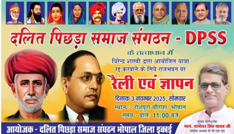 धीरेन्द्र शास्त्री द्वारा अनावश्यक रूप से यात्रा करके देश की गंगा जमुनी तहजीब को बिगाडने का प्रयास किया जा रहा है। जिनकी यात्रा जो कि असंवैधानिक रूप से की जा रही है। उसे शीघ्र रोक लगाने हेतु 3 नवम्बर को दलित पिछड़ा समाज संगठन के बेनर तले दामोदर सिंह यादव अपने सैकड़ों समर्थकों के साथ राजपाल महोदय को ज्ञापन देंगे और धीरेन्द्र शास्त्री की यात्रा पर रोक लगाने हेतु ज्ञापन सौंपा जायेगा। संगठन के प्रमुखों द्वारा अपील की है कि अधिक से अधिक संख्या में सभी लोग शामिल हो।