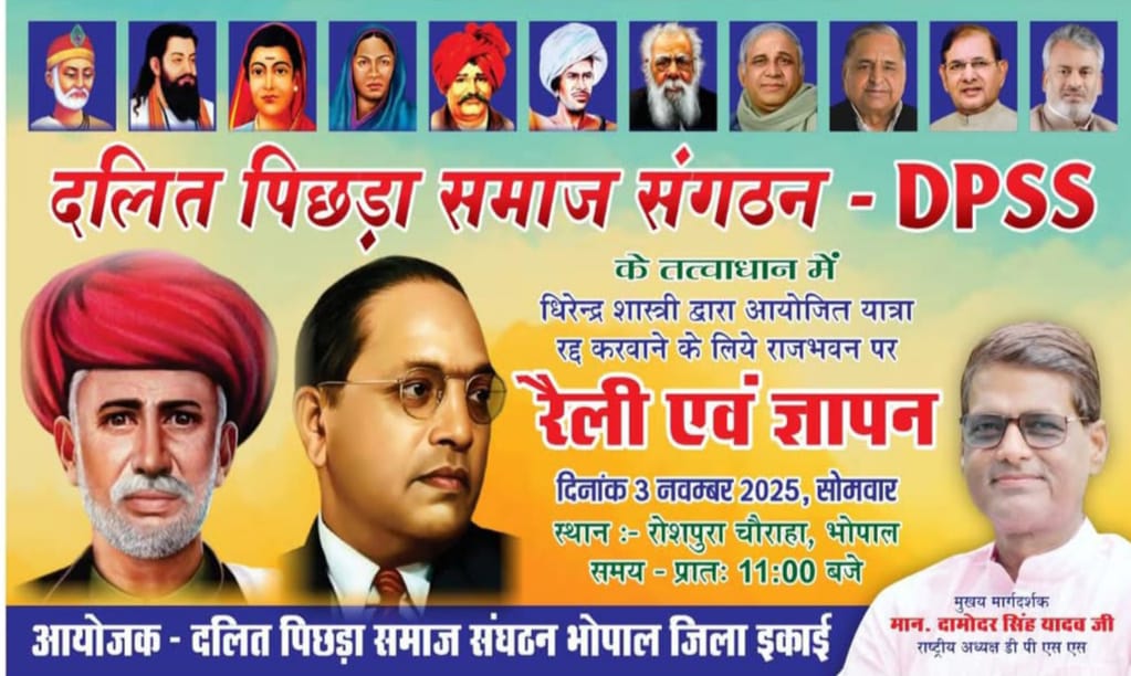 भोपाल। दलित पिछड़ा समाज संगठन के तत्वावधान में दिनांक 3 नवम्बर 2025 को रोशनपुरा चौराहे पर पर एकत्रित होकर दलित पिछड़ा समाज के सैकड़ो नागरिकों के साथ संगठन के संस्थापक दामोदर सिंह यादव के नेतृत्व में बागेश्वर के बाबा धीरेन्द्र शास्त्री जो कि अपने बोलचाल में ठठरी बांधने की गाली देकर हर किसी का अपमान करते हैं।