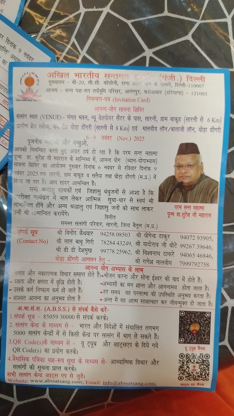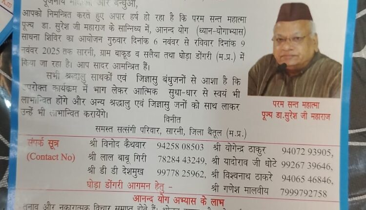 परम संत महात्मा पूज्य डॉक्टर सुरेश जी महाराज के सानिध्य में आनंद योग साधना शिविर का आयोजन 7 नवंबर दिन शुक्रवार को दोपहर 3:00 बजे से बालाजी मैरिज लोन घोड़ा डोंगरी में आयोजित किया जा रहा है .। अखिल भारतीय संतमत सत्संग दिल्ली के माध्यम से यह शिविर श्री विनोद कैथवर जी सारणी के मार्गदर्शन में आयोजित किया जा रहा है।
