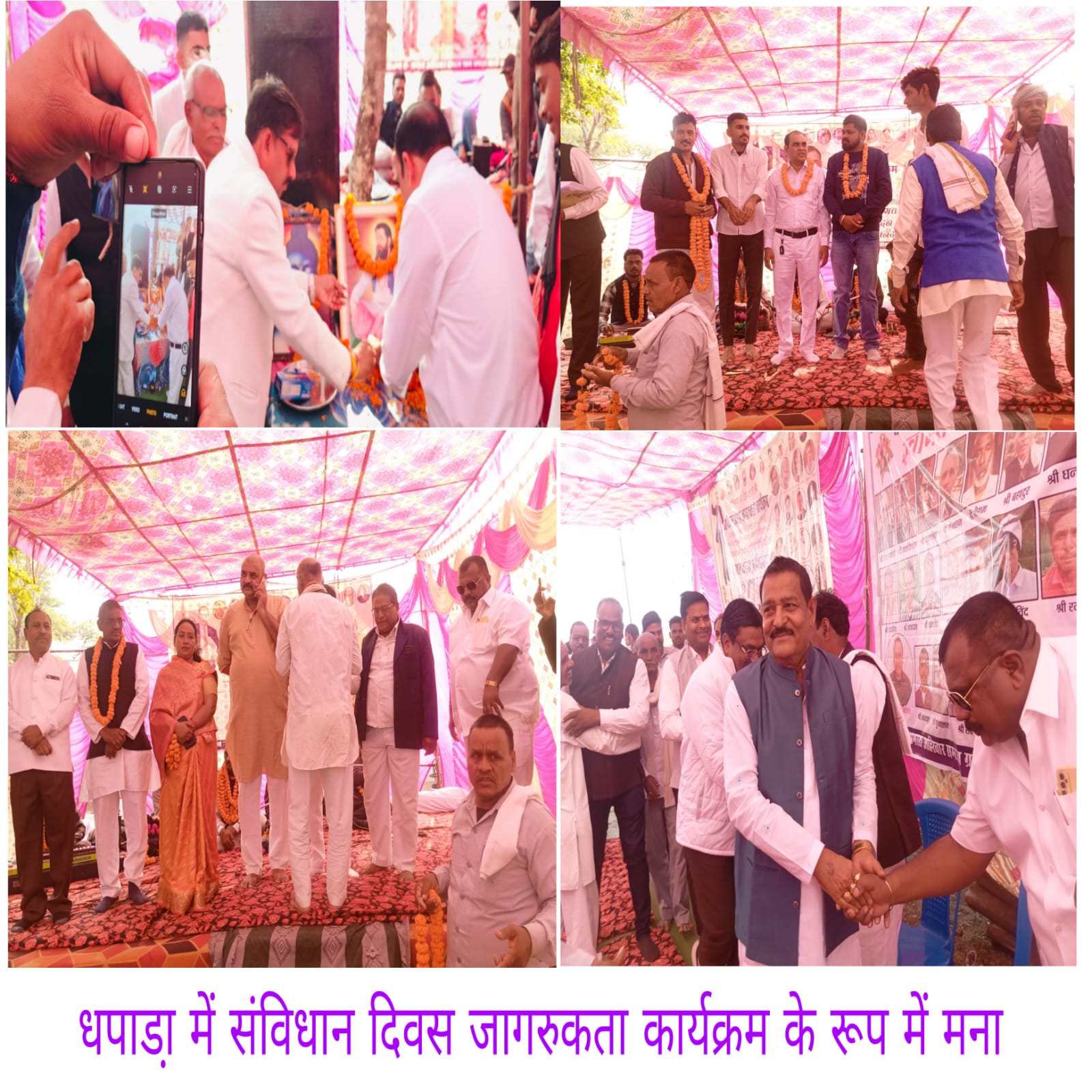 कार्यक्रम के आयोजकों ने सभी अतिथियों को माला पहनाकर स्वागत किया। धपाडा़ के एडवोकेट हेमराज अहिरवार , सीताराम अहिरवार एवं समस्त ग्राम वासी कार्यक्रम के आयोजक थे। ने सभी अतिथियों का कार्यक्रम में पधारने के लिए आभार व्यक्त किया। कार्यक्रम में क्षेत्र की श्रीमती सुरेखा शाह ने महिला की टीम के साथ संविधान दिवस के मौके पर महिलाओं के साथ महापुरुषों के छायाचित्र पर फूल अर्पित कर नमन किया। कार्यक्रम में अहिरवार समाज के महान स्वतंत्रता संग्राम सेनानी अमर शहीद वीर मनीराम अहिरवार के सुपौत्र मूलचन्द मेधोनिया ने अपने उद्बोधन में संविधान दिवस की शुभकामनाएं सभी को देते हुए कहा कि हमारे वर्ग में अनेक महापुरुषों का जन्म लिया है जैसे कि बाबा साहेब अम्बेडकर जी जिनका काम न सिर्फ भारत में सराहा जाता है