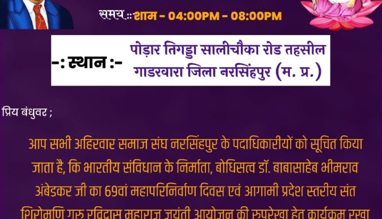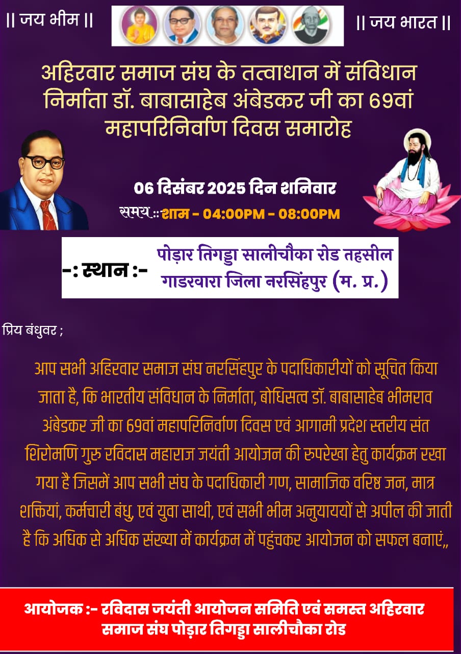 अहिरवार समाज के तत्वावधान में संविधान निर्माता बाबा साहेब अम्बेडकर जी का 69 वां महापरिनिर्वाण दिवस समारोह दिनांक 06 दिसम्बर 2025 दिन शनिवार को समय 4 बजे से सालीचौका पोडा़र तिगडा़ तहसील गाडरवारा जिला नरसिंहपुर मध्यप्रदेश में श्रद्धांजलि अर्पित करते हुए सामाजिक लोग उपस्थित होगें।