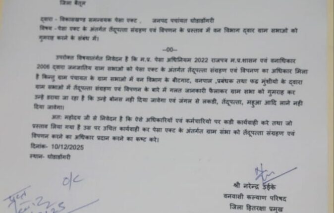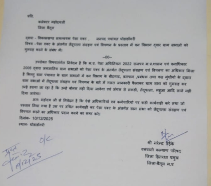 बैतूल।नरेन्द्र उईके वनवासी कल्याण परिषद जिला हितरक्षा प्रमुख जिला-बैतूल म.प्र ने कलेक्टर बैतूल को दिए आवेदन में आरोप लगाया है कि वन विभाग के कर्मचारी ग्राम सभाओं को गुमराह कर रहे हैं उन्होंने कलेक्टर को सौपे ज्ञापन में आरोप लगाया की म.प्र. पैसा अधिनियम 2022 राजपत्र म.प्र.शासन एवं वनाधिकार 2000 दारा जनजातिय ग्राम सभाओं को पैसा एक्ट के अंतर्गत तेंदूपत्ता संग्रहण एवं विपनण का अधिकार मिला है किन्तु