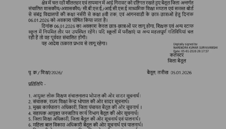 क्षेत्र में जारी शीतलहर एवं तापमान में आई गिरावट को दृष्टिगत रखते हुए कलेक्टर बैतूल श्री नरेन्द्र कुमार सूर्यवंशी द्वारा जिले के समस्त शासकीय, अशासकीय, सीबीएसई, आईसीएसई, माध्यमिक शिक्षा मण्डल एवं अन्य सभी बोर्ड से संबद्ध विद्यालयों में अध्ययनरत कक्षा नर्सरी से कक्षा 8वीं तक के छात्र-छात्राओं के लिए 06 जनवरी 2026 को अवकाश घोषित किया गया है।