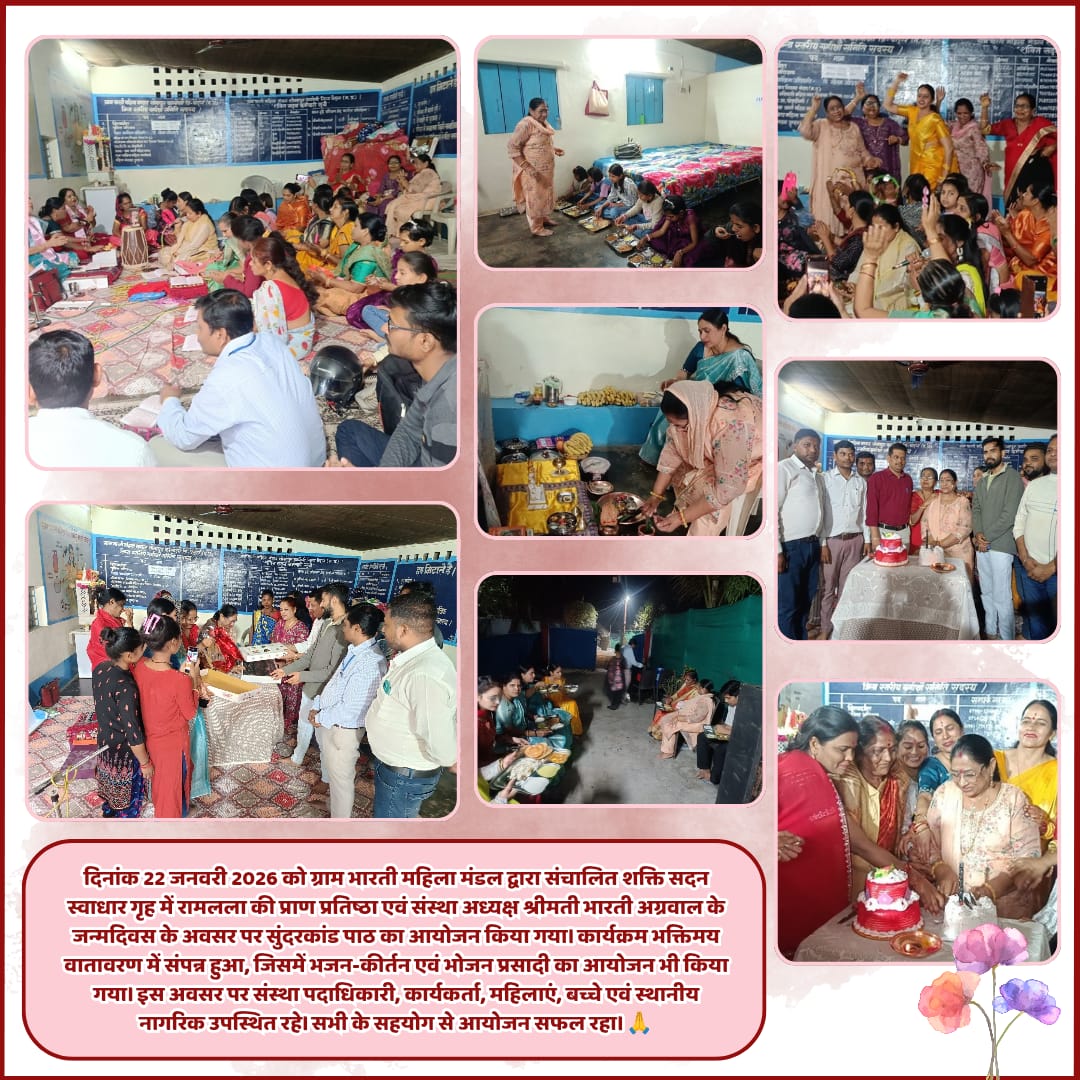 दिनांक 22 जनवरी 2026 को ग्राम भारती महिला मंडल द्वारा संचालित शक्ति सदन स्वाधार गृह में रामलला की प्राण प्रतिष्ठा के पावन अवसर एवं संस्था अध्यक्ष श्रीमती भारती अग्रवाल के जन्मदिवस के उपलक्ष्य में सुंदरकांड पाठ का भव्य आयोजन किया गया। यह कार्यक्रम बड़े ही हर्षोल्लास, श्रद्धा एवं आध्यात्मिक वातावरण में संपन्न हुआ। कार्यक्रम की शुरुआत विधिवत पूजा-अर्चना के साथ की गई, जिसके पश्चात महिलाओं द्वारा सुंदरकांड पाठ एवं जस-भजन का सामूहिक गायन किया गया। पूरे परिसर में भक्तिमय माहौल बना रहा, जिससे उपस्थित सभी जन आध्यात्मिक ऊर्जा से अभिभूत हुए।