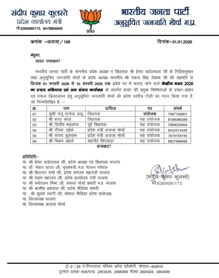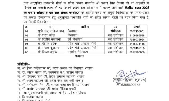 यह टोली प्रदेश स्तर में केंदीय बजट 2026 का प्रसार अभियान एवं जन संवाद कार्यक्रम के अंतर्गत बजट की प्रमुख विशेषताएं के प्रसार प्रचार की सफल क्रियान्वन हेतु प्रदेश भर में कार्य करेंगी इस टोली में प्रदेश संयोजक नेपानगर विधायक मंजू दादू को बनाया गया है और प्रदेश सहसंयोजक में दीपक उइके, छिंदवाड़ा महापौर विक्रम आह्के,मंडला जिला पंचायत अध्यक्ष संजय कुशराम,विधायक शरद कोल को बनाया गया है