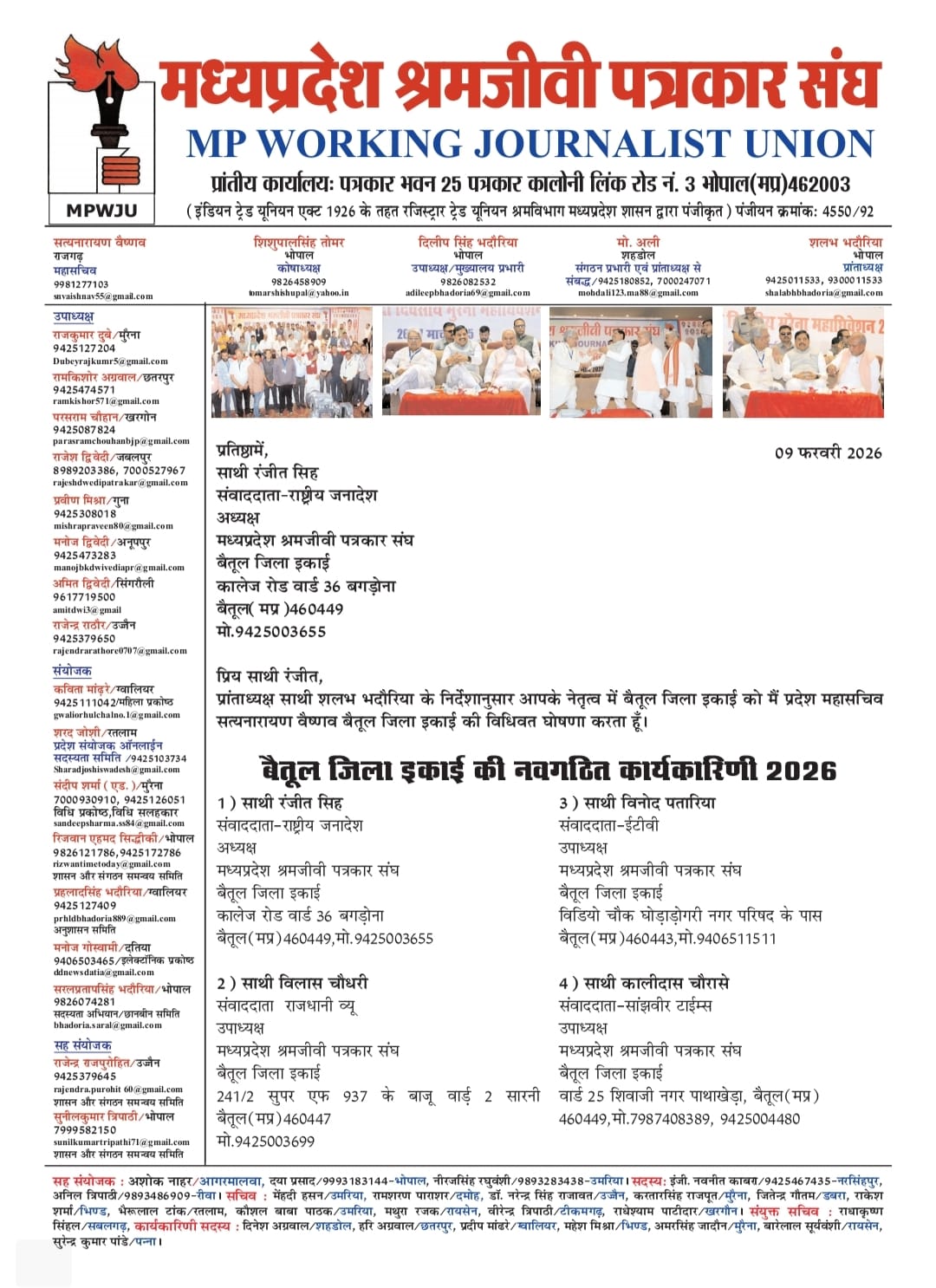 मध्यप्रदेश श्रमजीवी पत्रकार संघ की बैतूल जिला कार्यकारिणी घोषित: रंजीत सिंह पांचवी बार बने निर्विरोध अध्यक्ष