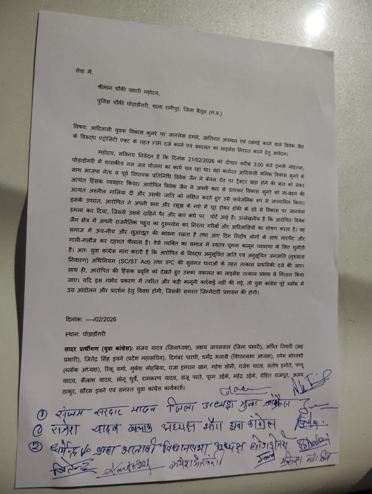 दिनांक 21/02/2026 को दोपहर करीब 3:00 बजे इमली मोहल्ला, घोड़ाडोंगरी में शासकीय नल जल योजना का कार्य चल रहा था। वहां कार्यरत आदिवासी श्रमिक विकास कुमरे के साथ भाजपा नेता व पूर्व विधायक प्रतिनिधि विवेक जैन ने केवल रोड पर ट्रैक्टर खड़ा होने की बात को लेकर अत्यंत हिंसक व्यवहार किया। आरोपित विवेक जैन ने अपनी कार से उतरकर विकास कुमरे को मां-बहन की अत्यंत अश्लील गालियां दी और उसकी जाति को लक्षित करते हुए उसे सार्वजनिक रूप से अपमानित किया। इसके उपरांत, आरोपित ने अपनी सता और रसूख के नशे में चूर होकर हॉकी के डंडे से विकास पर जानलेवा हमला कर दिया, जिससे उसके दाहिने पैर और बाएं कंधे पर चोटें आई हैं।