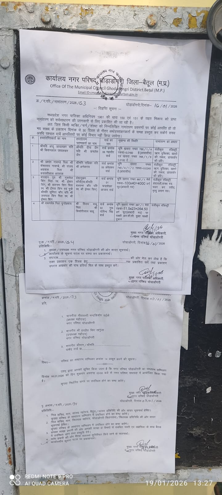 बैतूल जिले के घोड़ाडोंगरी नगर परिषद में शासकीय भूमि की बिक्री धड़ल्ले से हो रही है भूमाफिया, भू एजेंट का मुख्य व्यवसाय आबादी भूमि का क्रय विक्रय का हो गया है और सबसे बड़ी बात यह है कि जिनके कंधों पर शासकीय आबादी भूमि को बचाने की जवाबदारी है नगर परिषद घोड़ाडोंगरी ऐसी शासकीय भूमि की रजिस्ट्रियों को नामांतरण करने में लगी हुई है।