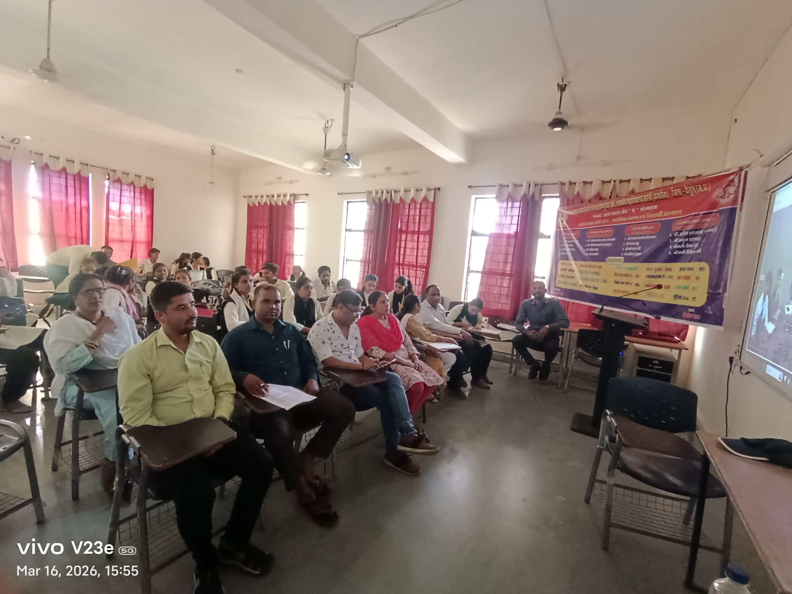 आयोजन दिनांक 11/03/2026, कक्ष क्रमांक 15 में सतत विकास लक्ष्य एसडीजी-3 (अच्छा स्वास्थ्य और खुशहाली) पर आधारित गतिविधियाँ, “आपदा प्रबंधन”, “सकारात्मक सोच को के लिए माइंड मैपिंग” एवं “तनाव मुक्त करने वाले खेल” का आयोजन 16/03/2026 दिन सोमवार को समय प्रातः 2:00 बजे से 04:00 बजे तक, कक्ष क्रमांक-16, 26 एवं वीर स्वतन्त्रता संग्राम सैनानी श्री सरदार विष्णुसिंह उईके शासकीय महाविद्यालय सारनी बागडोना महाविद्यालय परिसर में प्राचार्य प्रदीप पंद्राम के संरक्षण एवं कार्यक्रम में एन.टी.एफ नोडल अधिकारी डॉ. दीपक कुमार मानकर के मार्गदर्शन में किया गया।