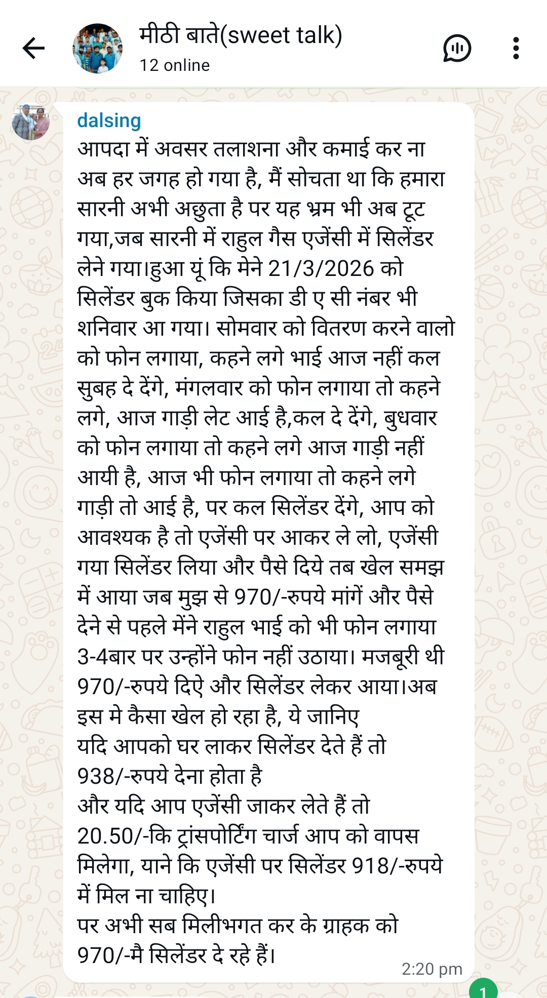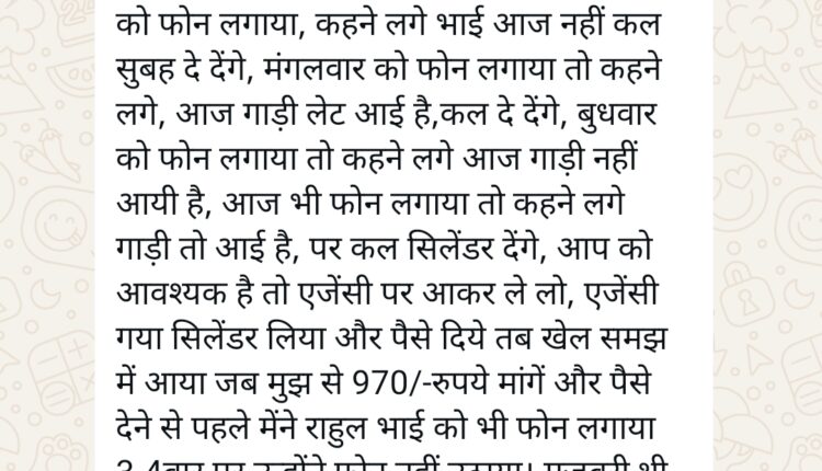 आपदा में अवसर तलाशना और कमाई कर ना अब हर जगह हो गया है, मैं सोचता था कि हमारा सारनी अभी अछुता है पर यह भ्रम भी अब टूट गया,जब सारनी में राहुल गैस एजेंसी में सिलेंडर लेने गया।हुआ यूं कि मेने 21/3/2026 को सिलेंडर बुक किया जिसका डी ए सी नंबर भी शनिवार आ गया। सोमवार को वितरण करने वालो को फोन लगाया, कहने लगे भाई आज नहीं कल सुबह दे देंगे, मंगलवार को फोन लगाया तो कहने लगे, आज गाड़ी लेट आई है,कल दे देंगे, बुधवार को फोन लगाया तो कहने लगे आज गाड़ी नहीं आयी है, आज भी फोन लगाया तो कहने लगे गाड़ी तो आई है, पर कल सिलेंडर देंगे, आप को आवश्यक है तो एजेंसी पर आकर ले लो, एजेंसी गया सिलेंडर लिया और पैसे दिये तब खेल समझ में आया जब मुझ से 970/-रुपये मांगें और पैसे देने से पहले मेंने राहुल भाई को भी फोन लगाया 3-4बार पर उन्होंने फोन नहीं उठाया। मजबूरी थी 970/-रुपये दिऐ और सिलेंडर लेकर आया।अब इस मे कैसा खेल हो रहा है, ये जानिए