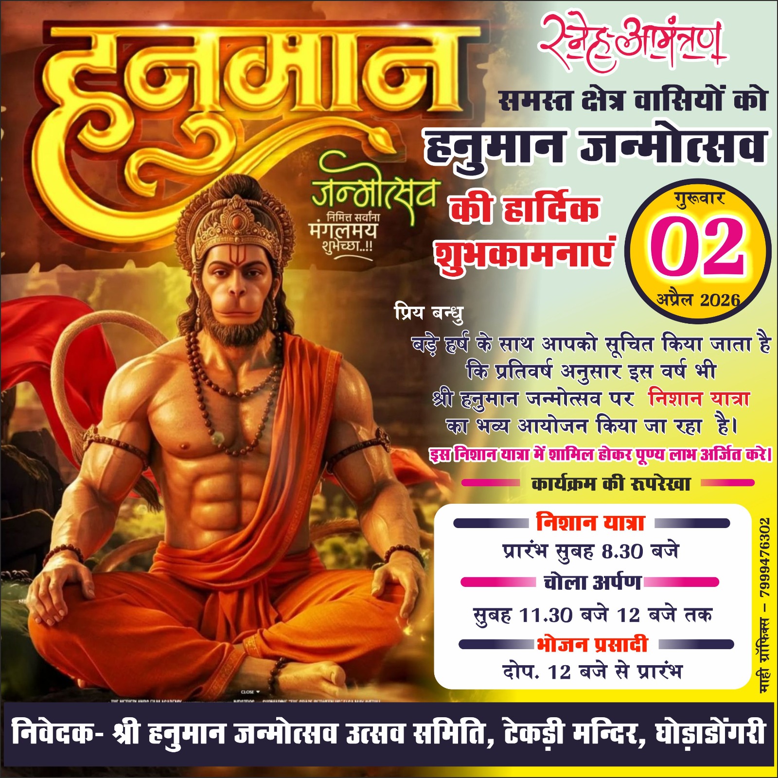 घोड़ाडोंगरी के बजरंग टेकडी मंदिर में प्रतिवर्ष अनुसार हनुमान जन्मोत्सव के पावन पर्व में निशान ध्वज यात्रा निकलेगी सालों से परम्परा अनुसार सुबह 8,30 बजे टेकडी मंदिर से यात्रा प्रारंभ होंगी जो नगर भ्रमण के बाद मंदिर पहुंचेगी जहां 11 बजे निशान और चोला हनुमानजी को चढ़ाया जायेगा