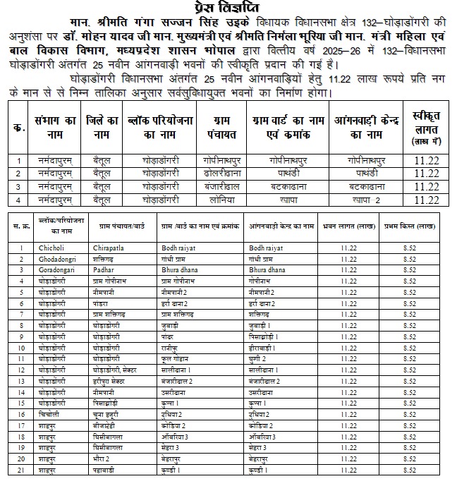 माननीय श्रीमती गंगा सज्जन सिंह उईके जी विधायक विधानसभा क्षेत्र 132-घोड़ाडोंगरी की अनुशंसा पर डॉ. मोहन यादव जी माननीय मुख्यमंत्री एवं श्रीमती निर्मला भूरिया जी माननीय मंत्री महिला एवं बाल विकास विभाग, मध्यप्रदेश शासन भोपाल द्वारा वित्तीय वर्ष 2025-26 में 132-विधानसभा घोड़ाडोंगरी अंतर्गत 25 नवीन आंगनवाड़ी भवनों की स्वीकृति प्रदान की गई है।