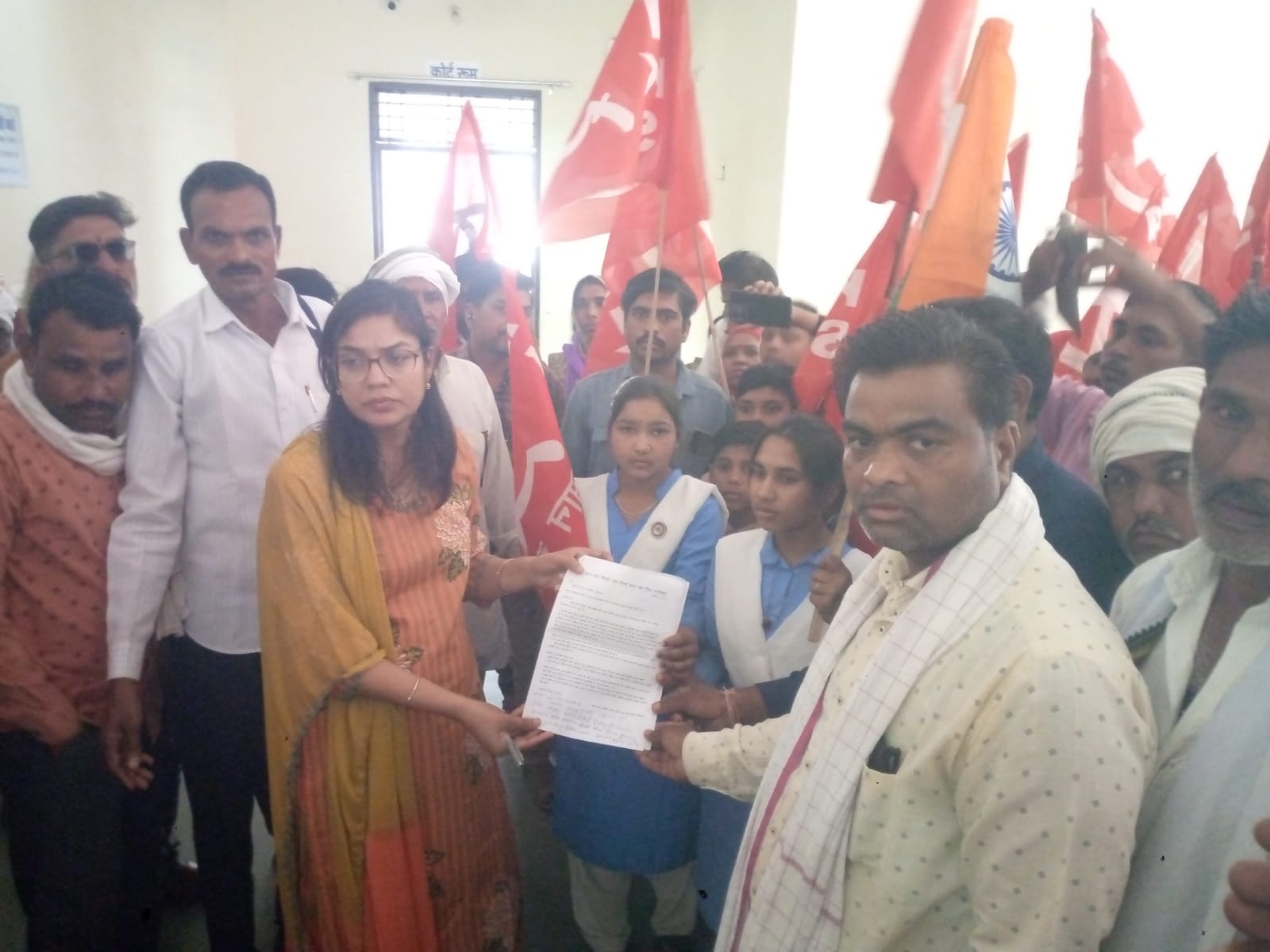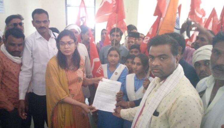 ज्ञापन सौंपते समय नाबालिग छात्र छात्राएं, एवं सैकड़ों ग्रामीण किसान सभा के झंडे लिए नारेवाजी करते हुए एस डी एम कलावती व्यारे को ज्ञापन सौंपा ।