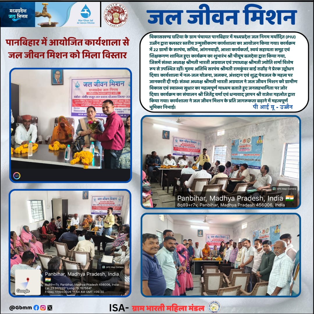 मध्यप्रदेश जल निगम मर्यादित, परियोजना क्रियान्वयन इकाई (PIU) उज्जैन द्वारा परियोजना प्रचार-प्रसार एवं क्षमतावर्धन कार्यक्रम के अंतर्गत ग्राम पंचायत पानबिहार के पंचायत भवन में क्लस्टर स्तरीय उन्मुखीकरण कार्यशाला का सफल आयोजन किया गया। इस कार्यशाला में विकासखण्ड घटिया के लगभग 22 ग्रामों के सरपंच, सचिव, ग्राम रोजगार सहायक, आंगनवाड़ी कार्यकर्ता, आशा कार्यकर्ता स्वयं सहायता समूह के अध्यक्ष सचिव एवं शिक्षकगण उपस्थित रहे। कार्यशाला में ग्राम भारती महिला मंडल बैतूल के संस्था अध्यक्ष श्रीमती भारती अग्रवाल जी वा संस्था उपाध्यक्ष श्रीमती ज्योति शर्माजी उपस्थित हुए। कार्यशाला का शुभारंभ श्री पीयूष बलदेवा जी (SQC विभाग)उज्जैन द्वारा किया गया। कार्यक्रम में संस्था से परियोजना समन्वयक , श्री मनोज खेलवाल, जितेंद्र