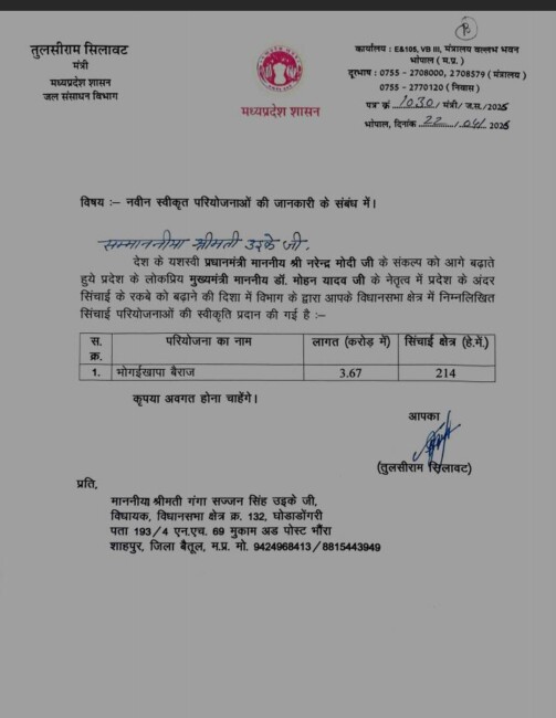 जल संसाधन मंत्री तुलसीराम सिलावट ने पत्र क्रमांक 10.30/मंत्री/ज.स./2025 के माध्यम से क्षेत्रीय विधायक श्रीमती गंगा सज्जन सिंह उईके को इसकी सूचना दी। पत्र में कहा गया है कि प्रधानमंत्री नरेंद्र मोदी के संकल्प को आगे बढ़ाते हुए प्रदेश में सिंचाई रकबा बढ़ाने की दिशा में यह स्वीकृति दी गई है।